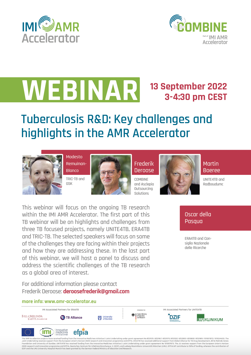About twenty people attended this webinar which focused on some highlights and challenges from three TB focused projects, namely UNITE4TB, ERA4TB, and TRIC-TB. The selected speakers, Modesto Remuinan-Blanco (TRIC-TB and GSK), Martin Boeree (UNITE4TB and Radboud UMC), Alfonso Mendoza-Losana (ERA4TB and Universidad Carlos III Madrid) and Oscar della Pasqua (ERA4TB and Consiglia Nazionale delle Ricerche) shared some of the challenges they have been facing within their projects and how they are addressing these. In the last part of this webinar, Frederik Deroose (Connecting Pharma) hosted a panel with whom he discussed and addressed the scientific challenges of the TB research as a global area of interest.