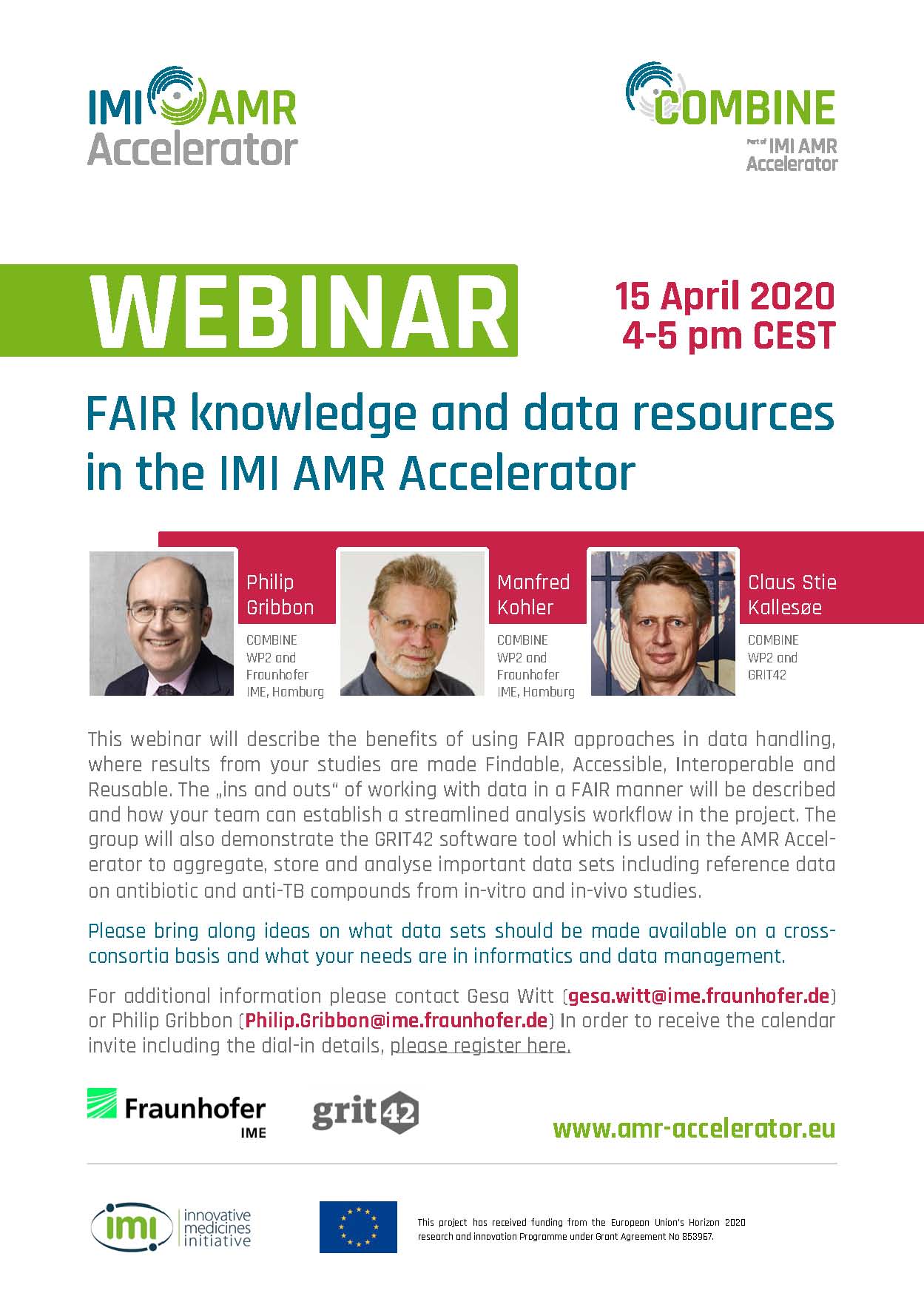 This webinar described the benefits of using FAIR approaches in data handling, where results from your studies are made Findable, Accessible, Interoperable and Reusable. The “ins and outs” of working with data were described and how teams can establish a streamlined analysis workflow in the projects. The group also demonstrated the GRIT42 software tool which was used in the AMR Accelerator to aggregate, store and analyse important data sets including reference data on antibiotic and anti-TB compounds from in-vitro and in-vivo studies.