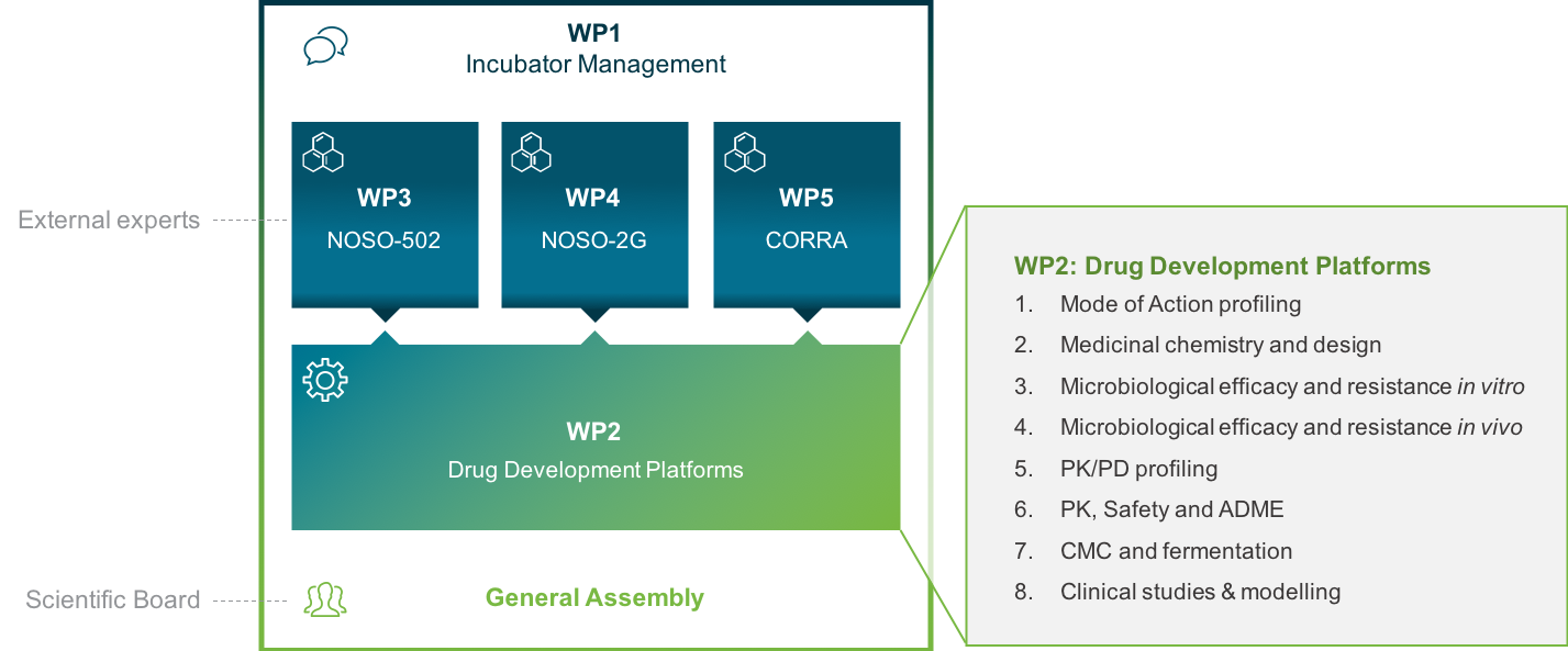 NOSO-502 is the first clinical candidate in the novel antibiotic class called Odilhorhabdins that was discovered by Nosopharm. It inhibits the bacterial ribosome with a new mechanism of action and is intended for the treatment of complicated Urinary Tract Infections (cUTI) and complicated Intra-Abdominal Infections (cIAI), including infections caused by polymyxin– and carbapenem-resistant Enterobacteriaceae (CRE). NOSO-502 has proven to be effective in vivo in Enterobacteriaceae infection models and demonstrated antibacterial activity in vitro against multi-drug resistant clinical isolates (NDM- and OXA-expressing strains and KPC among others). In June 2022, an important milestone was reached for the NOSO-502 programme with the completion of the GLP toxicology studies. The results allow for the further development of the programme to Phase 1. Read more in this Consortium press release.